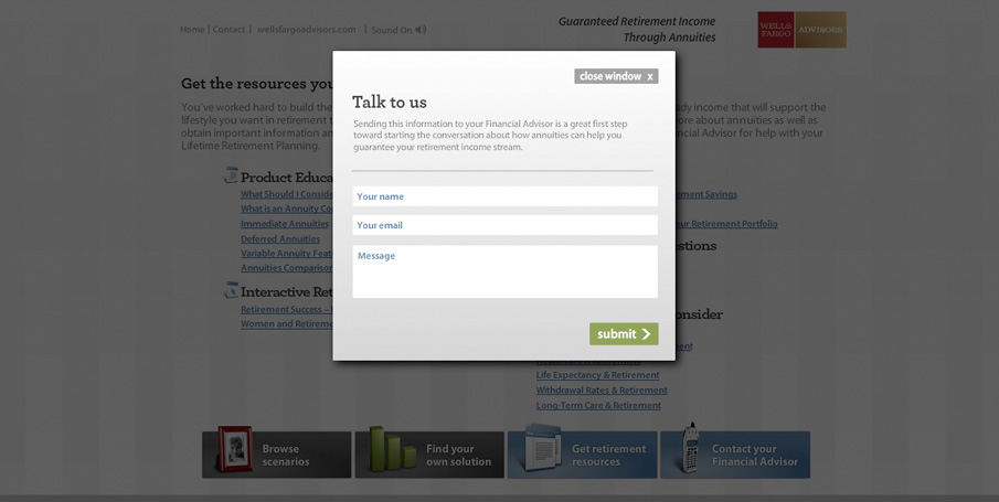 Wells Fargo came to IQ looking for help in distilling and clarifying the value of annuities in the face of economic change. An interactive tool was developed to determine the gap in planned versus unplanned expense. The site serves as an information portal for prospective clients seeking to understand annuities in more depth, while also providing tools and resources to Financial Advisors seeking to help their clients.